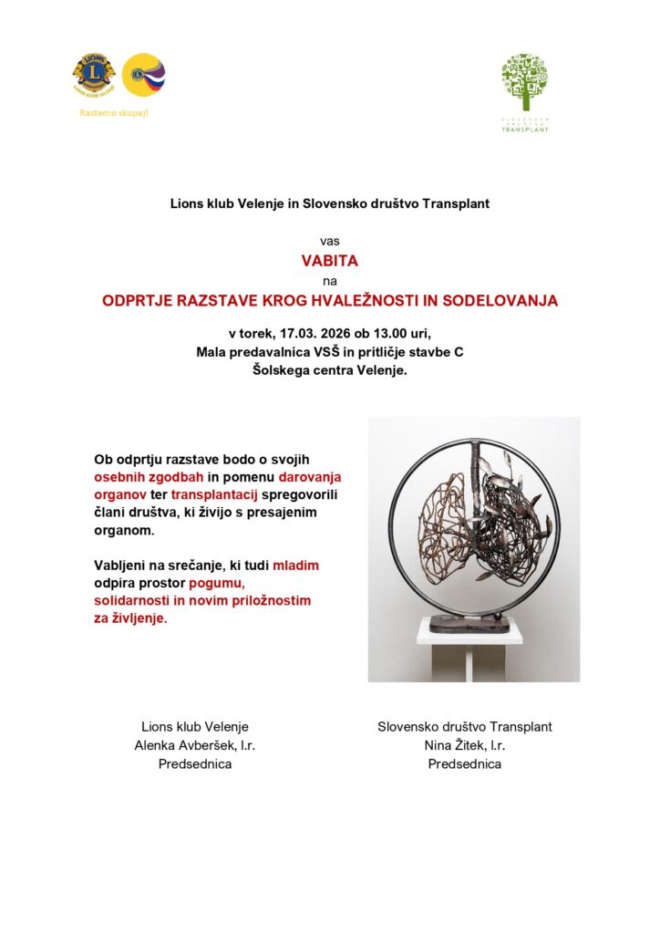 Na Šolskem centru Velenje je v torek, 17. 3. 2026, potekal dogodek ob odprtju razstave o darovanju organov in pomenu solidarnosti med ljudmi. Uvodnemu nagovoru je sledila zanimiva okrogla miza, na kateri so gostje iz Slovenskega društva Transplant in Lions kluba Velenje delili svoje osebne izkušnje, osvetlili pomen darovanja organov ter poudarili pomen ozaveščanja javnosti […]